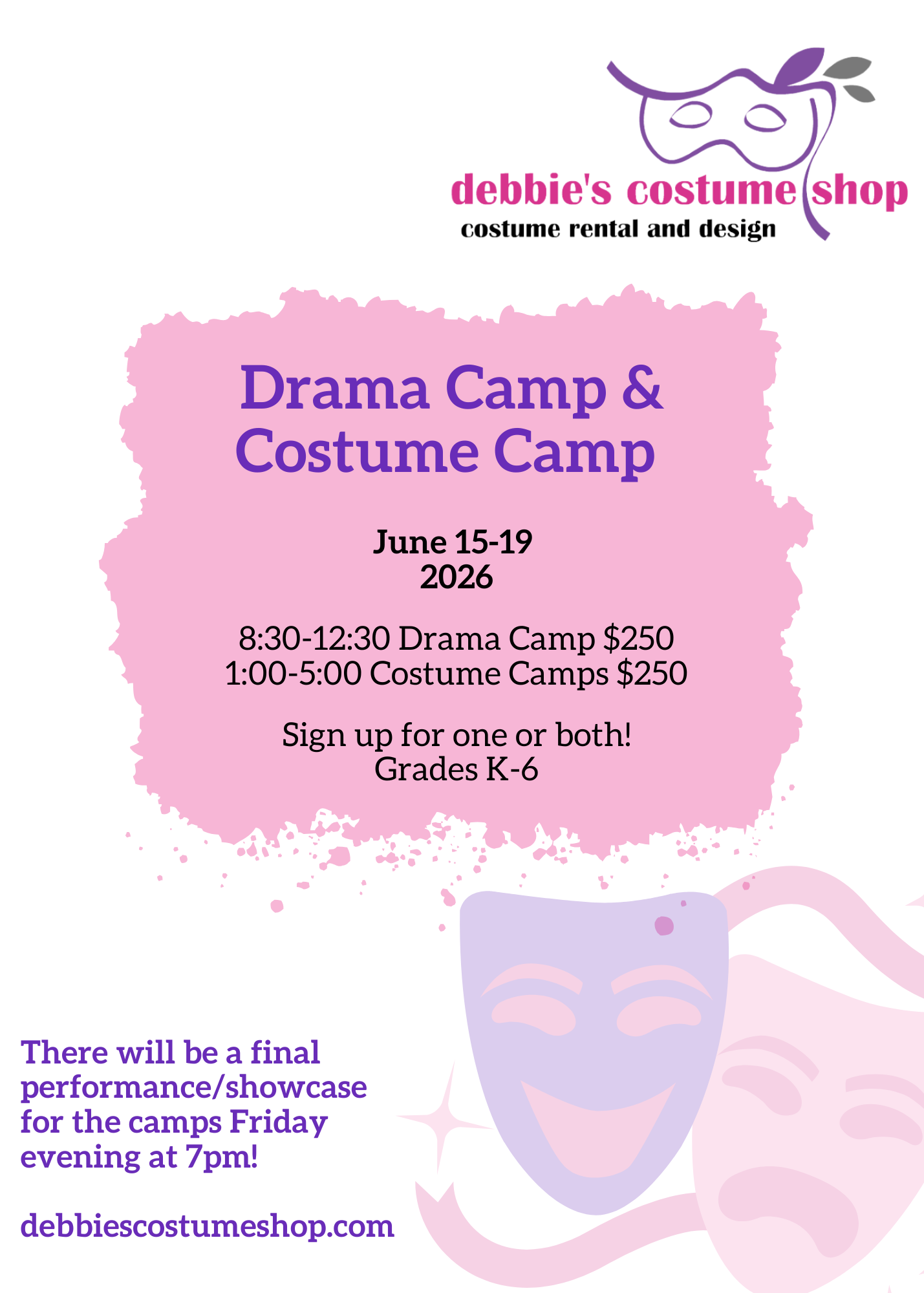 Debbie’s Costume Shop is bringing back their summer camps again this year! You can sign up for one camp or both. If you sign up for both campers will pack a lunch and stay the full day. Camp dates are June 15-19.